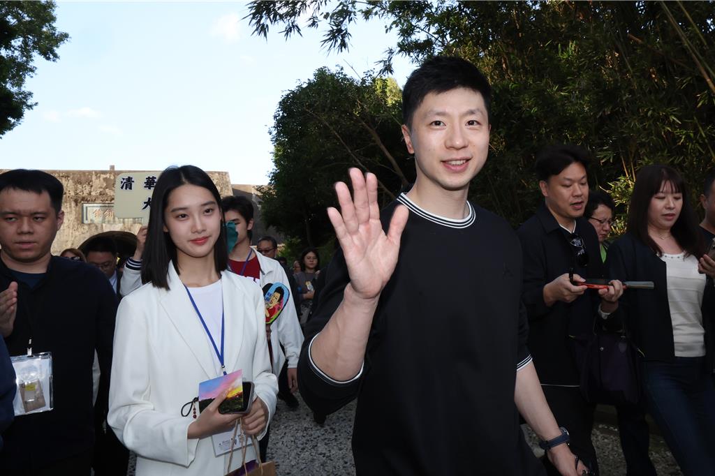 ▲陆生团3日参访沪尾炮台、淡水河岸步道、红毛城等地。马龙(右前)、陆生彭弋航(中后,白衣者)等人亲切地跟粉丝打招呼。中时