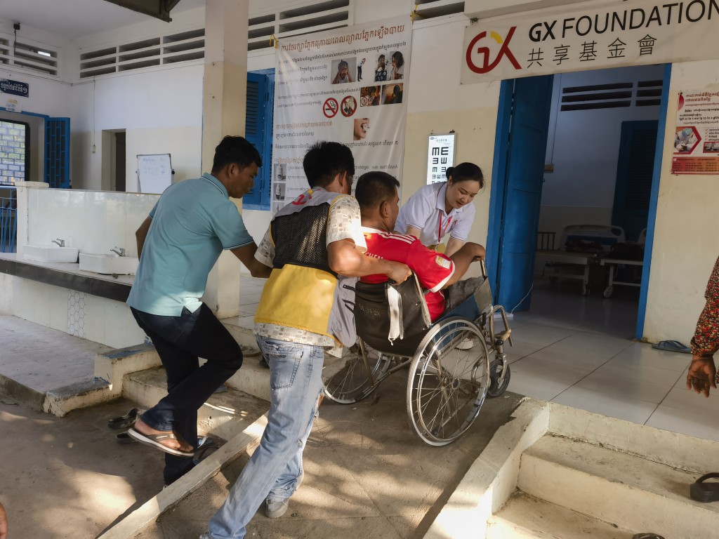 ▲在波罗勉项目点,有些病人因失明而行动不便,需要轮椅代步,医疗队成员与当地志愿者合力将他送到不同检查的地点,然后接受手术。