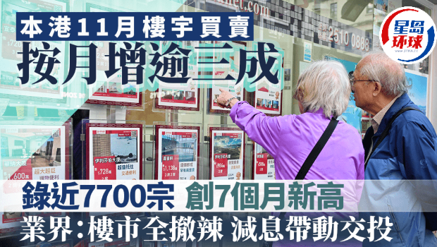 楼市气氛向好,连带交投跟随增加。土地注册处数据显示,上月整体物业买卖录7689宗,按月上升逾31%,连升两个月,创今年4月后7个月新高。11月整体楼宇买卖合约(包括住宅、车位及工商舖物业)注册量录7689宗,主要反映10月楼市状况,宗数较10月5857宗,上升31.3%,对比去年同期3532宗,更上升1.18倍。