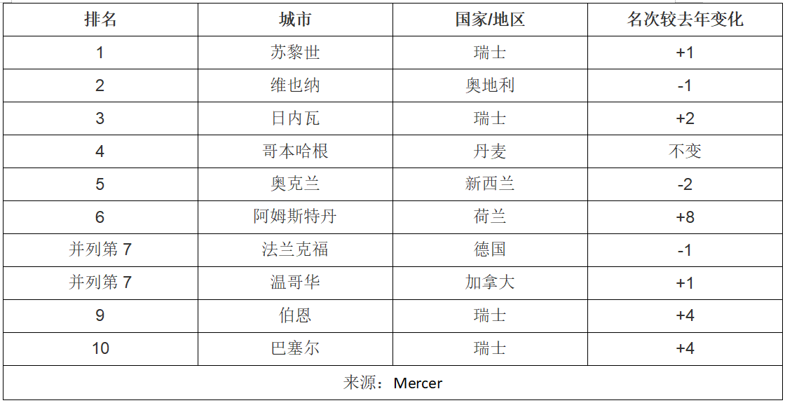 全球城市生活质素排名首10位