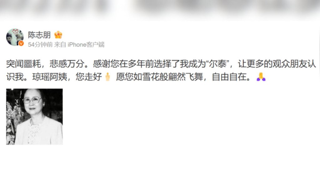 曾参演琼瑶作品改编的剧集《还珠格格》系列捧红不少明星,曾出演该系列作品的陈志朋、黄晓明得悉琼瑶离世,亦悲痛发文哀悼。陈志朋凭饰演《还珠格格》人气角色“尔泰”而广为人知,听闻噩耗的他,也在facebook悼念琼瑶,“突闻噩耗,悲感万分。感谢您在多年前选择了我成为‘尔泰’,让更多的观众朋友认识我。琼瑶阿姨,您走好,愿您如雪花般翩然飞舞,自由自在”。而男星黄晓明则在《还珠格格第三部:天上人间》出演小燕子的胞兄“萧剑”,可谓是他生涯代表角色之一,他也在微博流露对琼瑶的不捨,“想起当年拍摄《还珠格格3》的那段时光,琼瑶阿姨一直在给我们鼓励,一直在引导我们,温暖我们,告诉我们要活得潇潇洒洒,那些美好的画面仿佛就在昨日。您的作品照亮了几代人的青春,也教会了我们如何去爱,如何去珍惜,如何去面对生活中的挑战与困境”,一生铭记对方的恩情,愿琼瑶得以安详。
