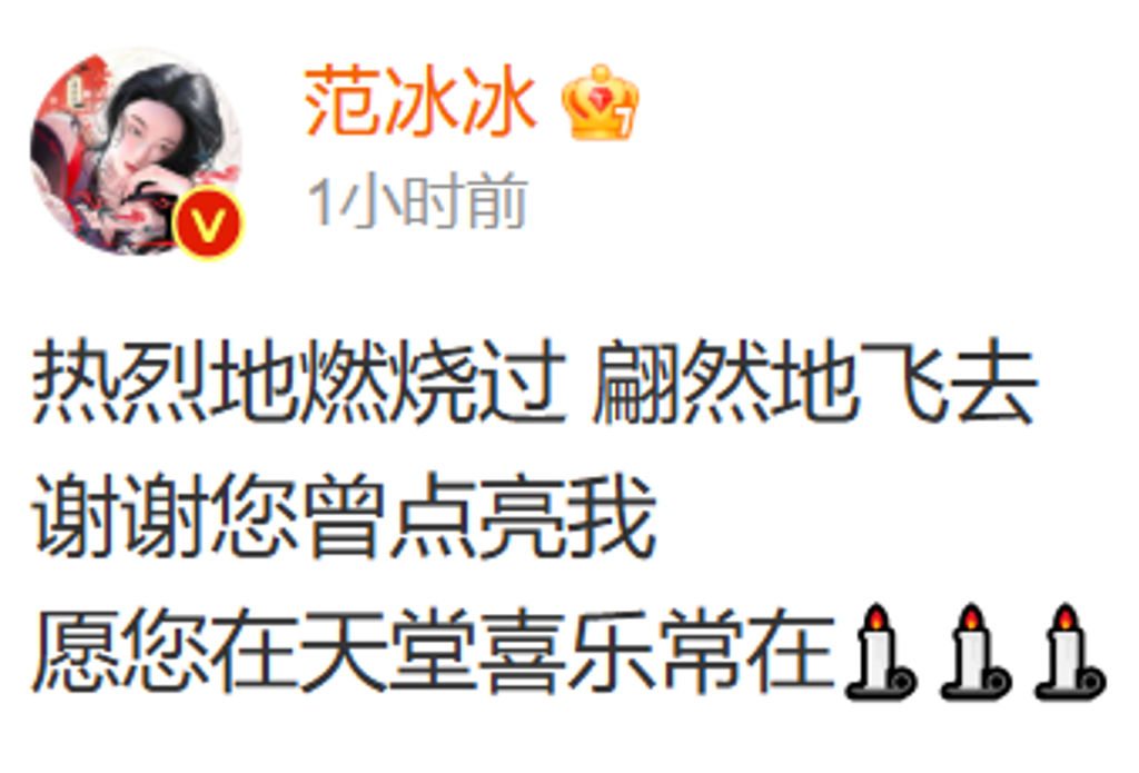 范冰冰稍早在个人微博发文,感谢恩师琼瑶过去的提携,“热烈地燃烧过,翩然地飞去,谢谢您曾点亮我,愿您在天堂喜乐常在”,并附上3根蜡烛的图案以表示祈福,随后粉丝也在留言区晒出《还珠格格》的剧照,代表琼瑶的好作品永远留存在大家心中,“愿琼瑶阿姨安息,会一直记住那些永恆的作品!”