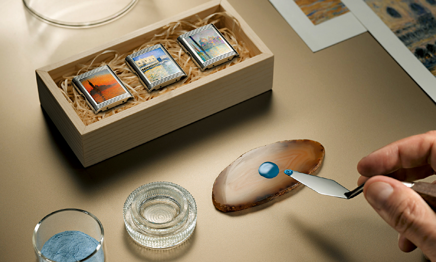 《黄昏的圣乔治马焦雷岛》表款采用蓝色大明火珐珐配人字纹扭索饰纹装饰,衬托画中的蓝色天空; 《威尼斯大运河》则以透明浅绿色大明火珐琅配合波浪图案,呼应大运河的河面波浪; 《总督宫》就以半透明蓝色大明火珐琅配合菱形扭索纹,重现画作描绘的波光。