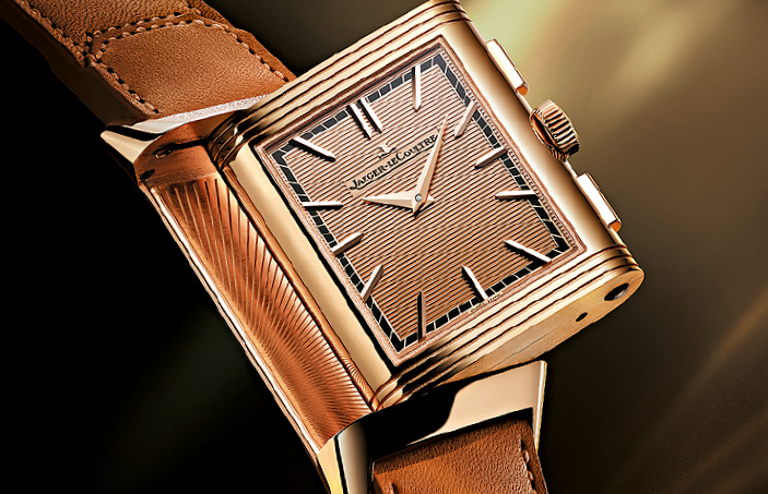 继去年推出Reverso Tribute Chronograph不锈钢和玫瑰金两个版本后,积家今年追加一款更奢华的全玫瑰金版本,表壳、表盘、小时刻度和机芯夹板一律以玫瑰金制作,不止正面带饰纹的两针表盘金光闪闪,背面配置30分钟逆跳累计的镂空计时表盘,同样金光灿烂。