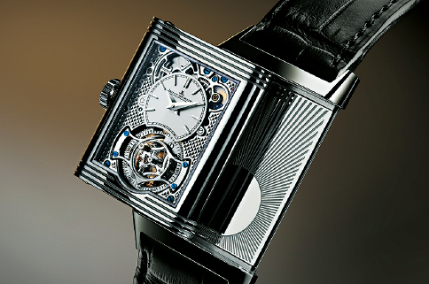正面放射纹表盘只透视了6点位采用滚珠轴承代替传统框架的陀飞轮,背面第二时区的镂空表盘则可透视更多齿轮,并饰有巴黎铆钉手工扭索纹的Reverso Tribute Duoface Tourbillon。 今年在原有的玫瑰金版本以外,新增售价相对较亲民,且容易衬衫及适合日常佩戴的不锈钢版本。