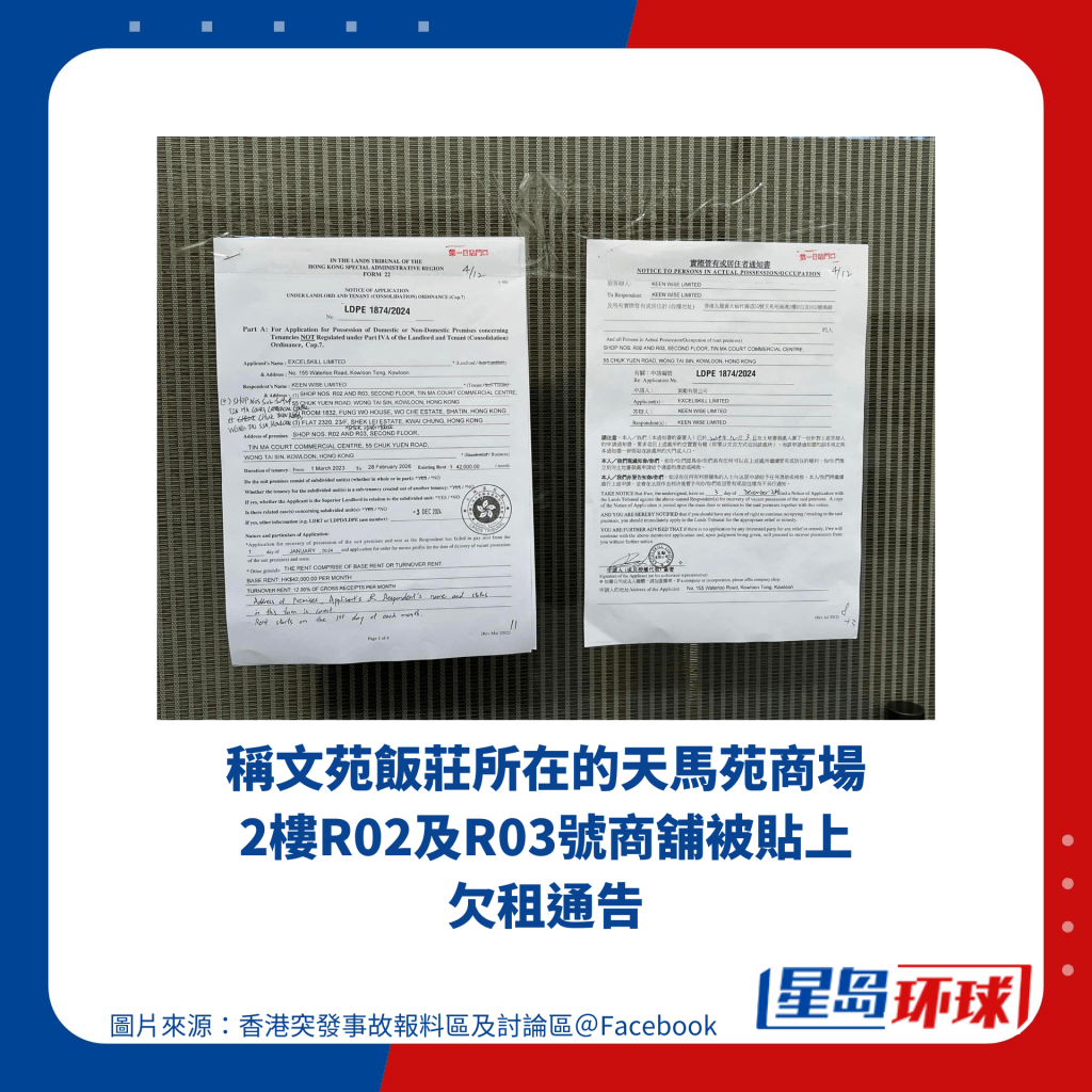 昨日(12月4日),有网民在Facebook群组“香港突发事故报料区及讨论区”中发帖,称文苑饭庄所在的天马苑商场2楼R02及R03号商铺被贴上欠租通告,内容写到文苑饭庄的租约期为2023年3月1日至2026年2月28日,而租用者自2024年1月起未能缴付每月$42,000的租金,现须支付欠交的租金以及每月总收益的12%。文苑饭庄大门前的另一则通告则写到业主已于2024年12月3日起向土地审裁处入禀申请通知书,要求以交吉方式收回店铺。