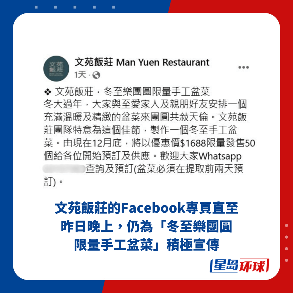 ▲文苑饭庄的Facebook专页直至昨日晚上,仍为“冬至乐团圆 限量手工盆菜”积极宣传。