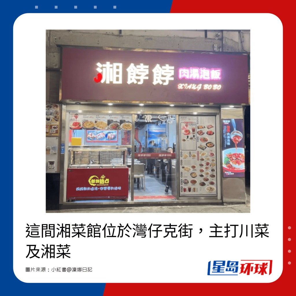 位于湾仔克街的“湘饽饽肉汤泡饭”,主打川菜及湘菜。从网民分享的帖文及相片可见,除了招牌肉汤泡饭,餐厅亦供应各款新鲜热辣的卤味,如辣卤牛腱、辣卤鸭肠及辣卤猪肚等,设有各款套餐,其中是日卤味套餐最平$48起,中式午市套餐则由$59起,标明可以无限添饭兼免收加一,新张期间推出8折优惠!