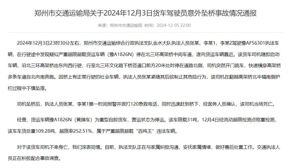 12月5日,郑州市交通运输局发布关于2024年12月3日货车驾驶员意外坠桥事故情况通报——