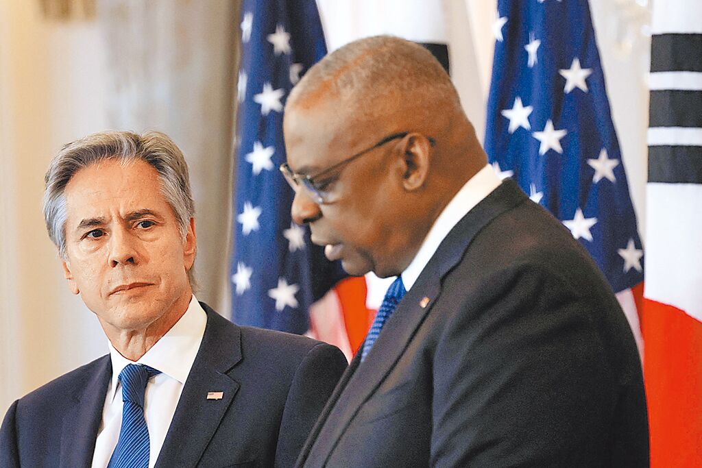 ▲美国防部长奥斯汀(右)取消访韩行程。(路透)