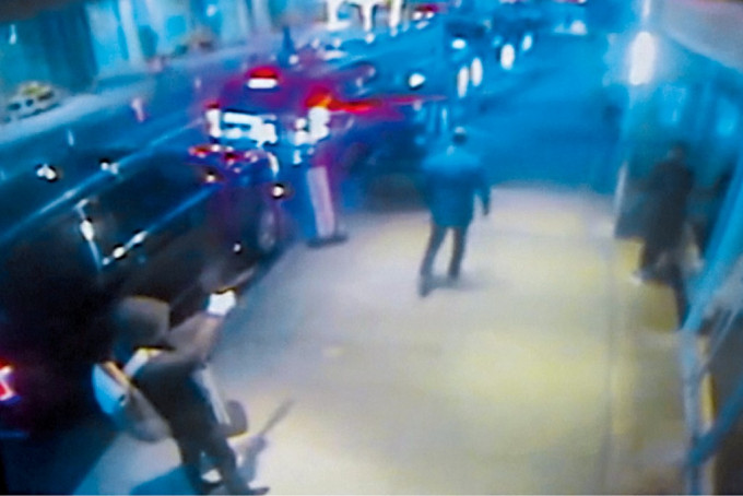▲闭路电视显示,枪手(左)在一间酒店外枪击汤普森(中)。