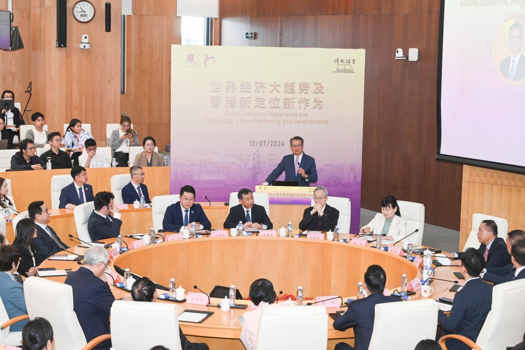 陈茂波随后作客博文讲堂,为师生作了题为《世界经济大趋势及香港新定位新作为》的演讲,深圳市副市长张华、师生代表、特邀嘉宾共200余人出席活动。他分享了全球经济社会发展三大趋势,即科技创新和变革、绿色和低碳转型、数字化发展,并分析当前再全球化和区域化,全球南方的崛起与地缘政治格局形势。