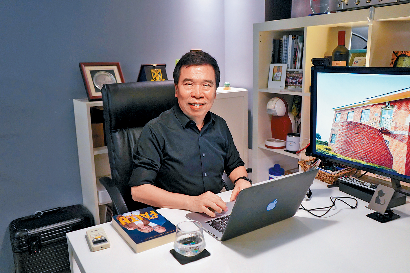 雨天早上,办公室内播放轻松悦耳的音乐,Sunny牧师一边喝热咖啡,一边为来港的非洲朋友引路,“今日他要自己坐港铁过来,怕不懂下车!”环顾四周放置的摆设不多,除了数本信仰书籍,也有他助养小孩的照片,全都挂 灿烂的笑容。