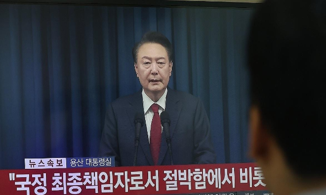 ▲12月7日,首尔市民收看尹锡悦对国民谈话的直播。图源:韩媒