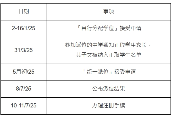 25学年的中一“自行分配学位”阶段,将于明年的1月2至16日接受申请,家长可在这阶段,在没有校网限制下,为子女申请2所中学参加派位的中学,校方将于明年的3月31日,通知正取学生家长,其子女被纳入正取学生名单,而未被纳入正取的学生,就要参加5月初的“统一派位”。