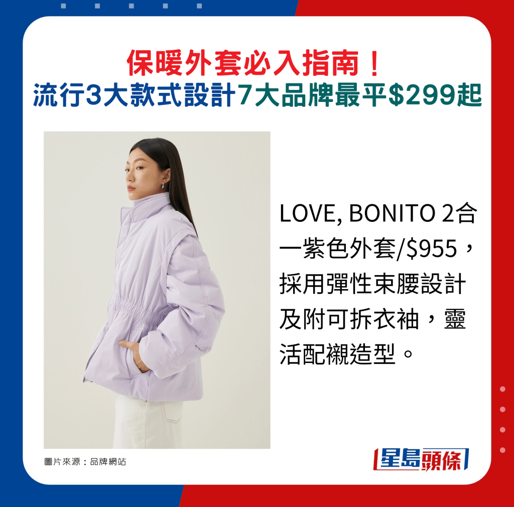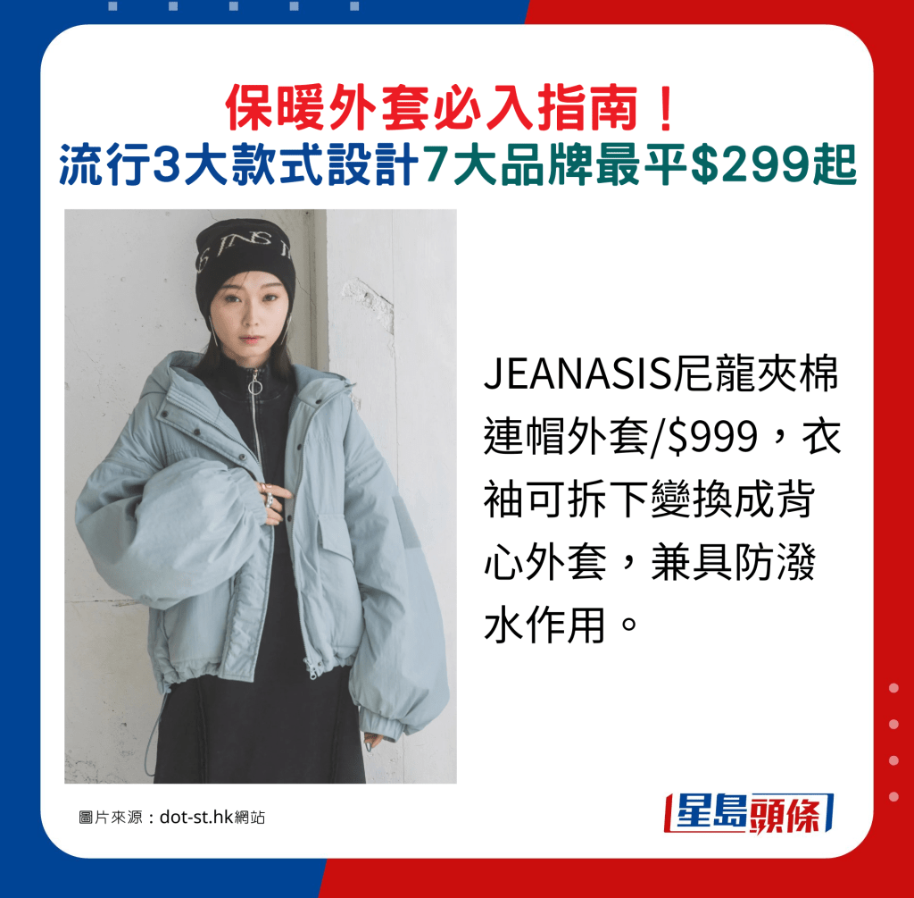 此外,LOVE, BONITO的新品中, 就找到用上束腰设计的款式, 既修饰身形线条美感,配搭可 拆式衣袖,令外套可变换成背 心穿着,迎合百变造型。日牌JEANASIS配以可拆式衣袖的全新尼龙夹棉连帽外套,具防泼 水功能,可应付落雨或落雪天气,外游必备。