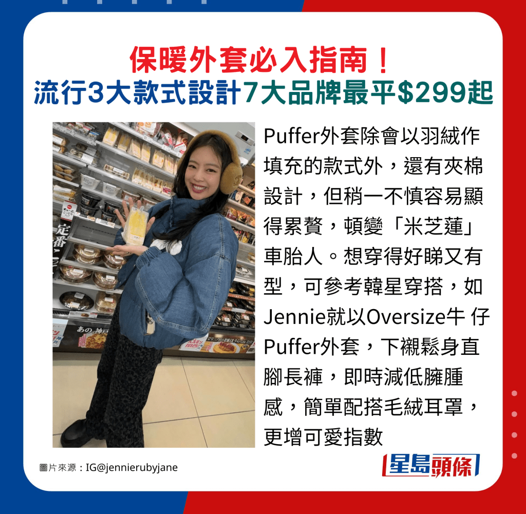 充满空气感的Puffer外套,触感软绵绵,除会以羽绒 作填充的款式外,还有夹棉设计,但稍一不慎容易显得累赘,顿变“米芝莲”车胎人。想穿得好睇又有型,可参考韩星穿搭,如Jennie就以Oversize牛 仔Puffer外套,下衬松身直脚长 裤,即时减低臃肿感,简单配搭毛绒耳罩,更增可爱指数。