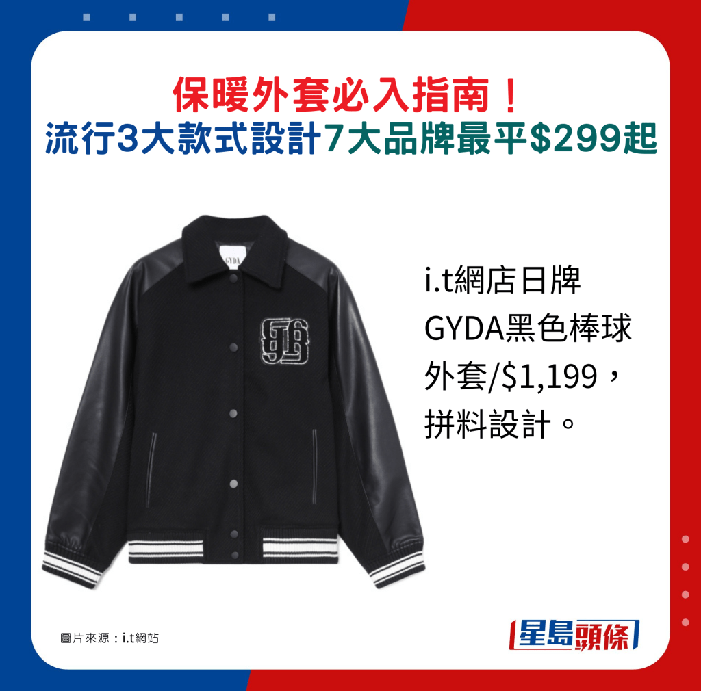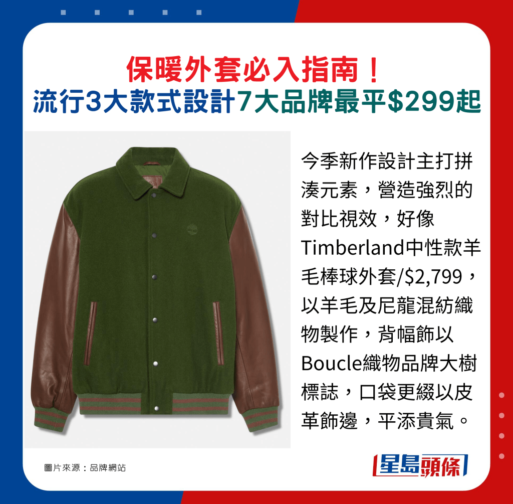 今季新作设计主打拼凑元素,营造强烈的对比视效,好像Timberland的全新 中性羊毛棒球外套,就以皮革拼羊毛和尼 龙混纺织物制作,并选用绿配啡色设计, 背幅饰以Boucle织物品牌大树标志,抢眼度十足,口袋更缀以皮革饰边,平添贵 气。至于日牌GYDA的全新棒球外套,融 入拼料设计,除了深浅不一的黑色调,又 在袖口及衣襬营造黑白对比。