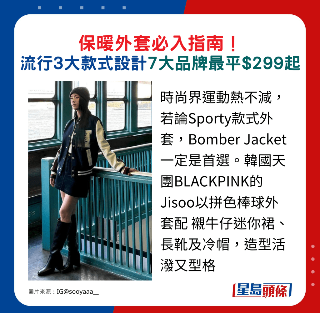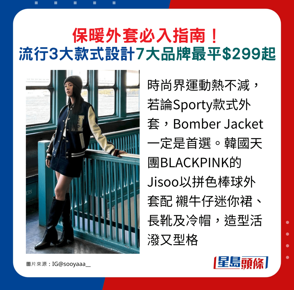 时尚界运动热不减,若论Sporty款式外套,Bomber Jacket一定是首选。韩国天团BLACKPINK的Jisoo以拼色棒球外套配 衬牛仔迷你裙、长靴及冷帽,造型活泼又型格。