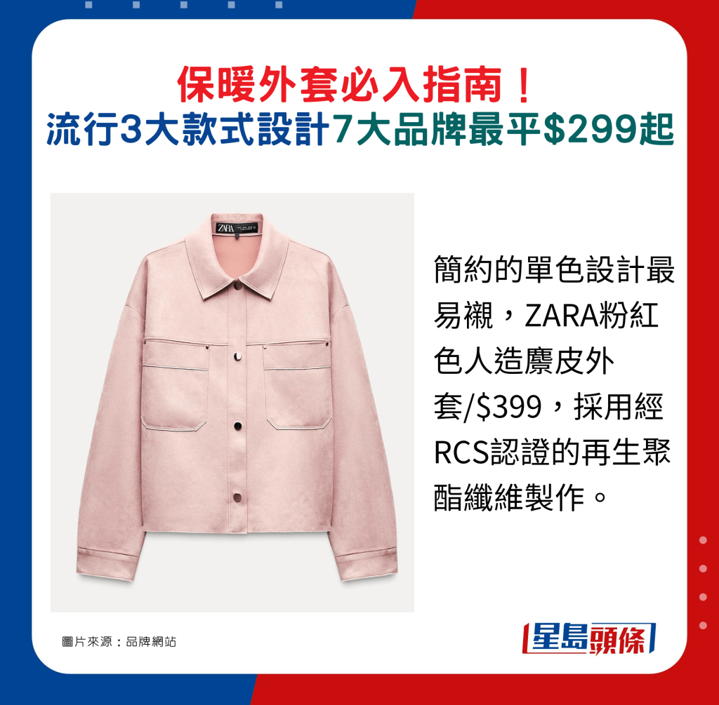 简约的单色设计最易衬,ZARA新作以人造麖皮面料,配搭金属钮扣等装饰,不失优 雅格调,以之配衬皮裤或皮裙,型格十足。H&M的新作则以简洁为卖点, Oversize剪裁配搭翻盖胸袋及金属钮 扣,跟牛仔裤及灯芯绒裙一拍即合, 最迎合随性又潇洒的造型。