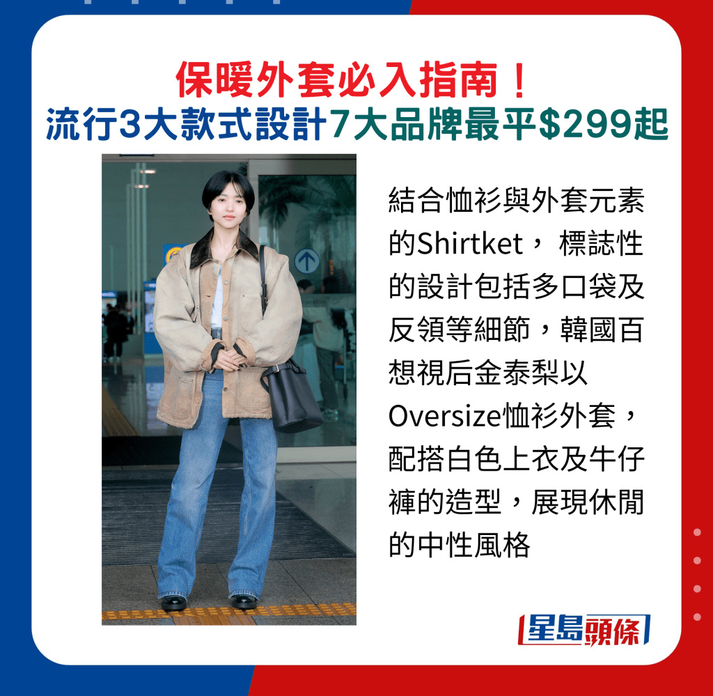 结合恤衫与外套元素的Shirtket, 标志性的设计包括多口袋及反领等细节,韩国百想视后金泰梨以Oversize恤衫外套,配搭白色上衣及牛仔裤的造型,展现休閒的中性风格。
