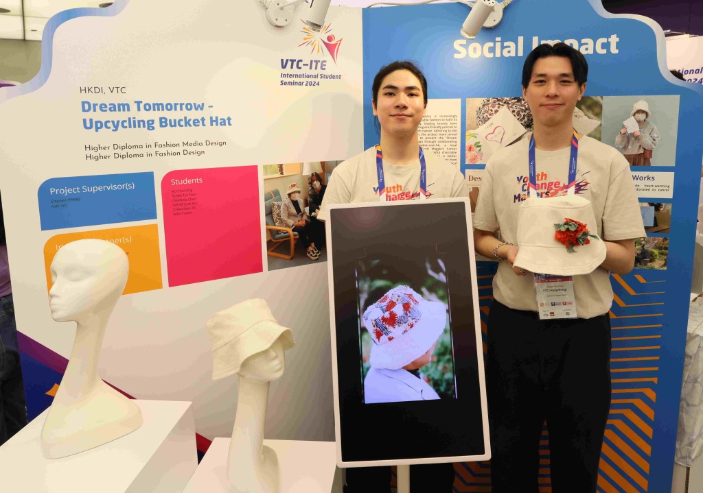 ▲HKDI时装设计高级文凭毕业生翁梓峻(Trev)(左)及时装媒体设计高级文凭毕业生陈家俊(Vince)(右)为“Dream Tomorrow — Upcycling Bucket Hat(梦想明天:渔夫帽升级再造关爱计划)”团队成员。(VTC提供)