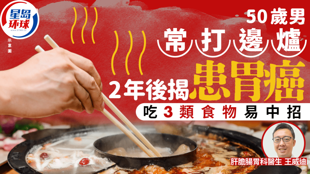 打边炉也有致癌风险? 有医生分享病例指,一名年约50岁男子经常打边炉,其后排黑便,2年后求医后确诊患上胃癌。 医生提醒,常吃3类食物容易增加风险。