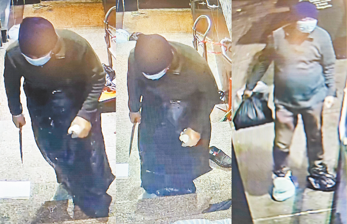 ▲案发现场凶嫌手持长尖刀靠近受害人及为防止溅血在身腰上围裹垃圾袋脚套塑料袋的样子。 本报图片