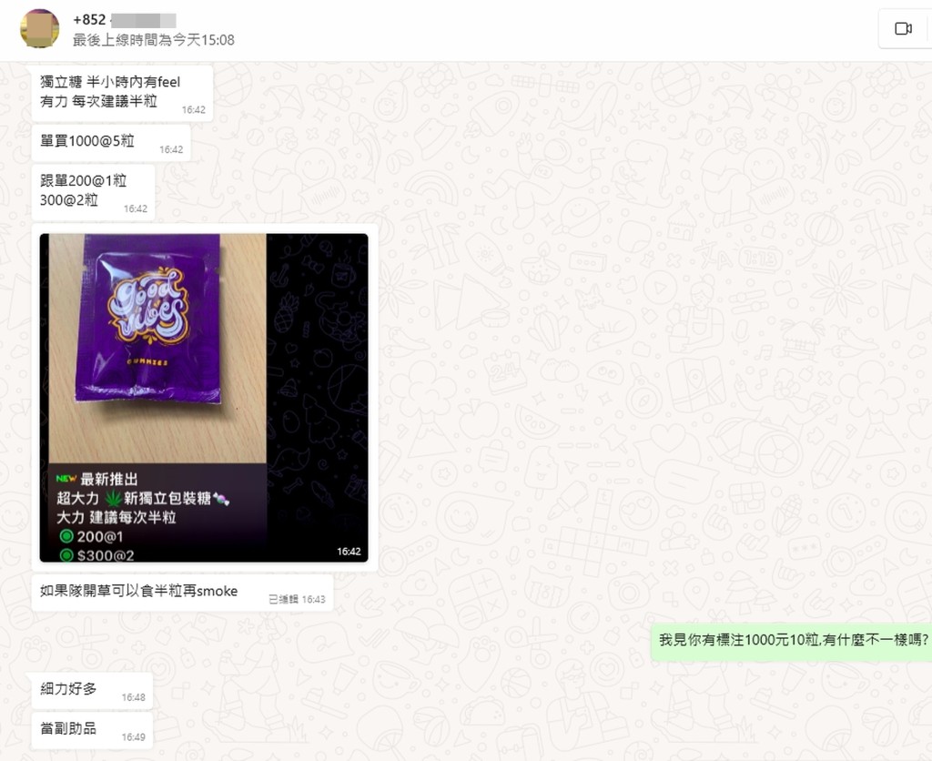 记者假称有意购买,毒贩说“货品”来自美国、加拿大和泰国的大麻合法化地区,选购1000元产品便可获免费送货服务;他又重点游说购买大麻“太空油”,形容“吸两啖就上头”,又推荐购买美国威斯康辛州推出的大麻糖:“半小时内有力、有feel,每次建议食半粒”,“300元2粒,每次半粒就可以‘嗨’成日,成本仅需75元,抵过食烟啦。”