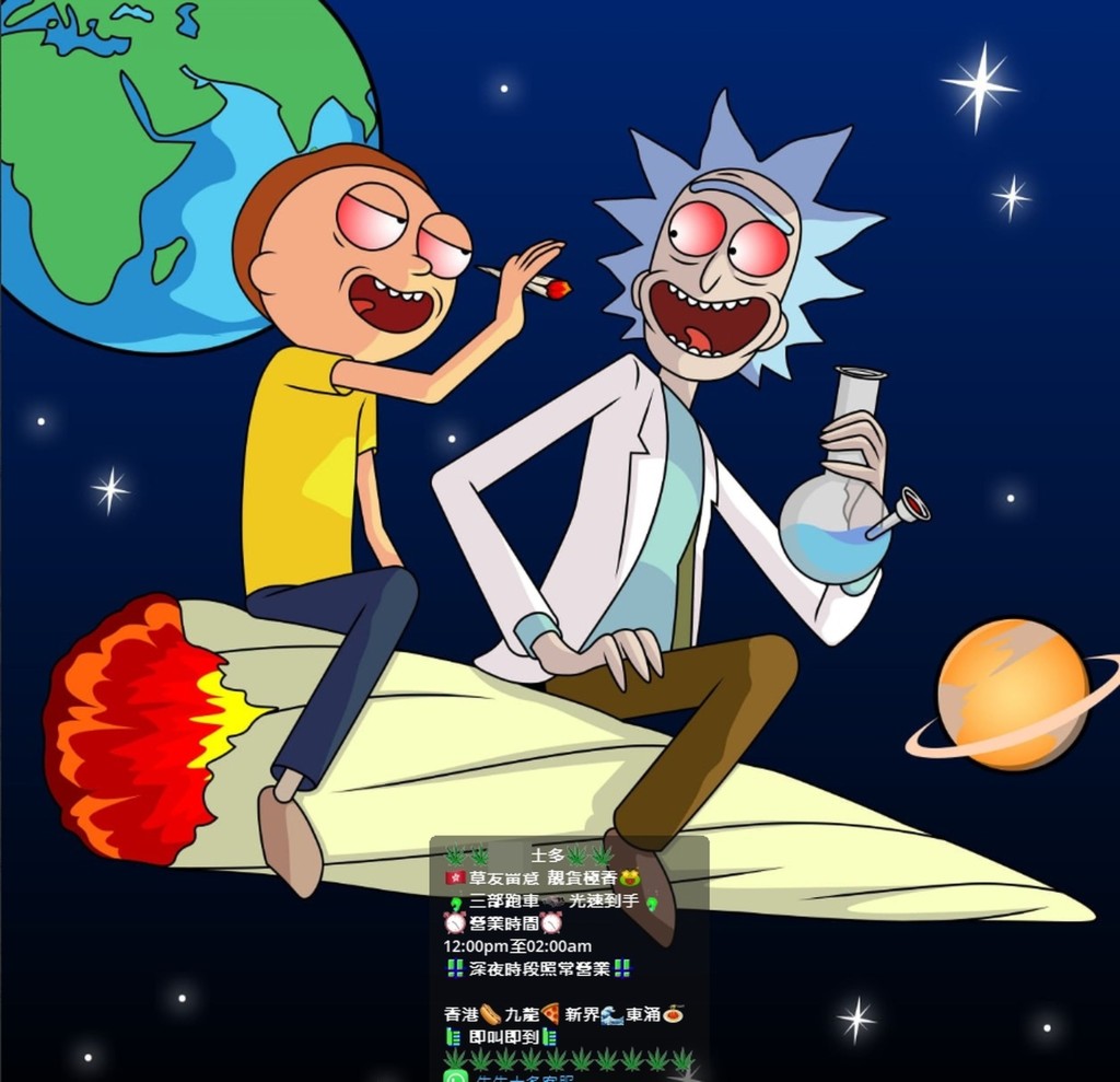 点击进入Telegram“毒品士多”专页后,可见色彩缤纷、新奇有趣的毒品宣传广告,其中一幅画盗用美国电视科幻情景喜剧动画《瑞克和莫蒂》(Rick and Morty)的角色,其中手持水烟壶的瑞克和高举卷烟的外孙莫蒂骑在卷烟型状的火箭上遨游太空,图片底部则留言:“草友留意,靓货极香”,明显是推销大麻;图中留言又称:“有3部跑车送货,光速到手,深夜时间照常营业。”