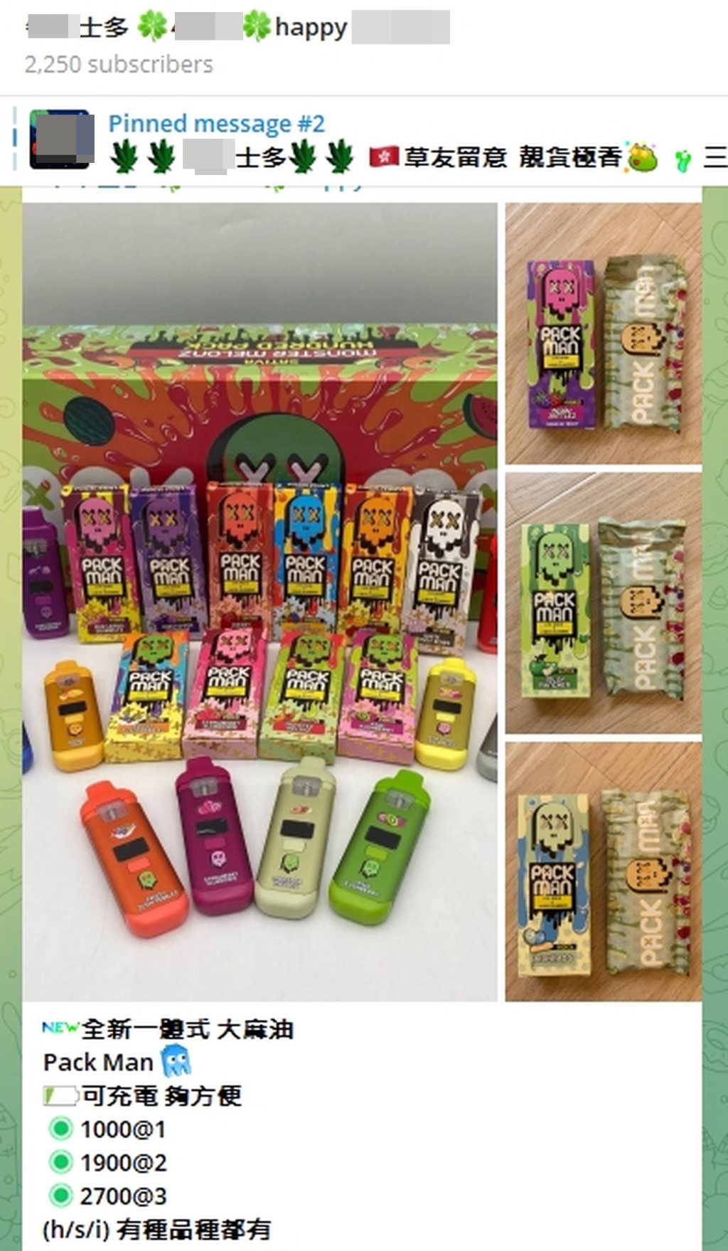 贩毒集团为拓展市场,纷纷通过社交媒体向年轻人销售毒品,《星岛》记者近日发现,有毒贩以“士多”为名在Facebook发放宣传广告,表面看似是一般网店,点击后却转往销售大麻产品和“太空油”的Telegram群组,当中可见大量以卡通图片宣传的大麻糖、大麻曲奇、大麻“太空油”等新款式毒品,亦有贴文介绍吸食方法和所谓益处,企图诱导青少年尝试;记者以年轻人身份联络,被推荐购买“两啖就上头”的大麻“太空油”,和数十元便可“嗨”足全日的大麻糖,声称“性价比”高于吸烟,更强调香港各区24小时“送货”上门,买毒品易过借火。警方特别提醒,“太空油”祸害深远,青少年切勿吸毒。
