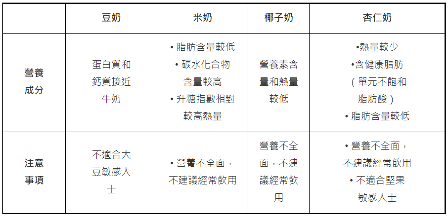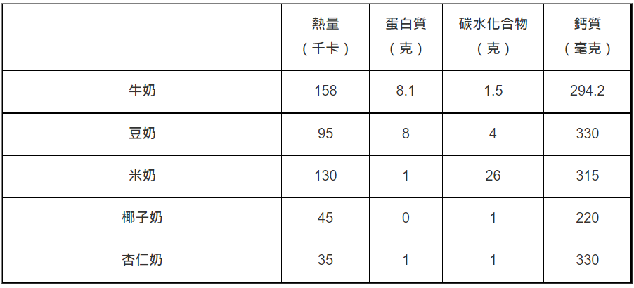 豆奶的蛋白质成分和牛奶相若,一杯240毫升就含有七至八克蛋白质。相比之下,米奶、椰子奶和杏仁奶的蛋白质含量较低,是牛奶的1/8或更少。在钙质方面,大部分植物奶都添加了钙质,含量与牛奶不相上下,一杯约含有300毫克钙;至于碳水化合物方面,一杯牛奶的碳水化合物含量约为12克,而米奶则高达26克,相当于半碗白饭的碳水化合物。杏仁奶的碳水化合物含量和热量在各种奶类中都是最低的。一般有口味的牛奶饮品(如朱古力、木瓜和香蕉等)会添加额外的糖分,令碳水化合物含量再提高,选购时要多留意营养标签上的糖分含量!建议这类高糖奶类只可当作happy food,而四岁或以下的幼童最好每日饮用不多于100毫升。