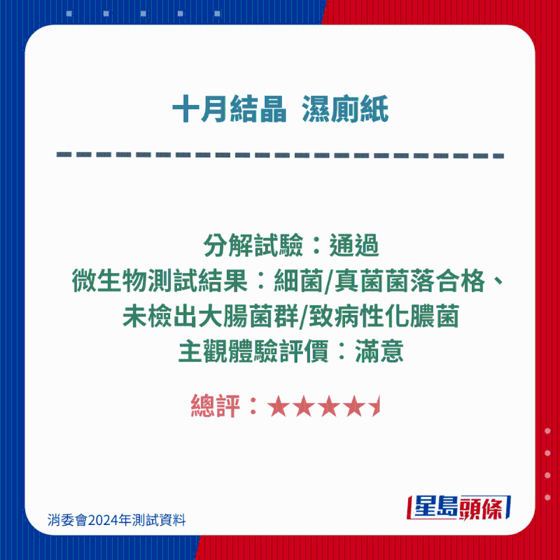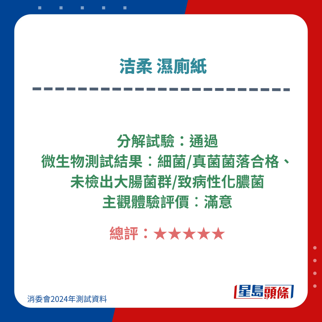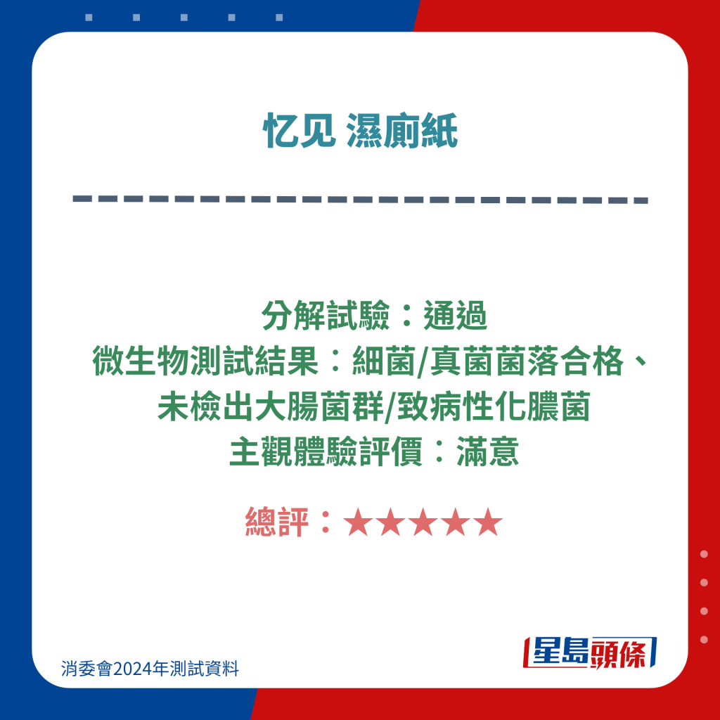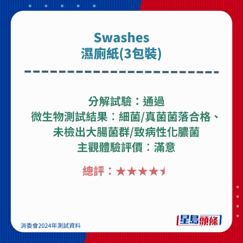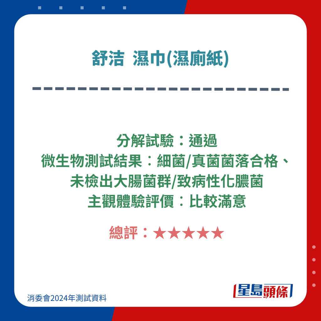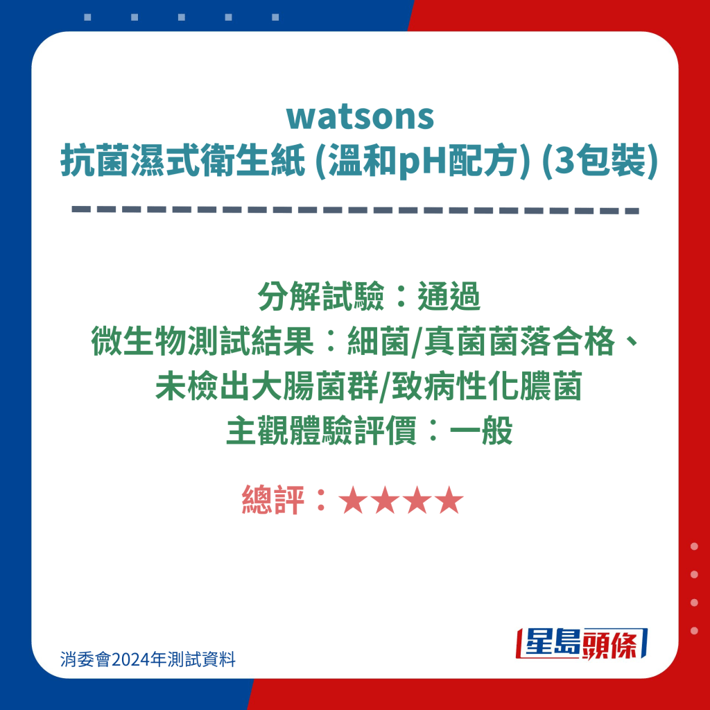 消委会在针对湿厕纸产品的评估中,测试人员针对产品的使用便利性、外观、尺寸、气味及对皮肤的即时刺激性进行了详细测试。参与评估的10位测试者年龄介于18至55岁,根据各项指标给予“满意”、“一般”和“不满意”的评价,最终综合得出总体评分。