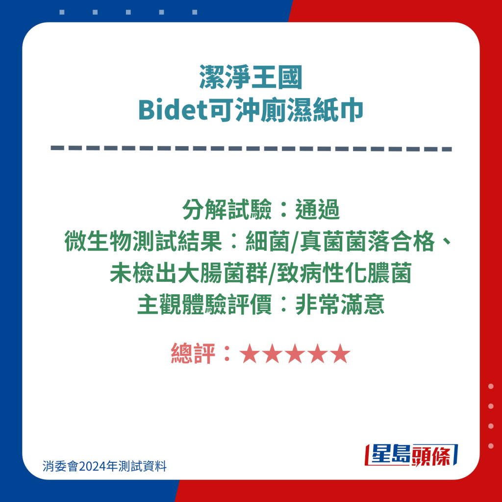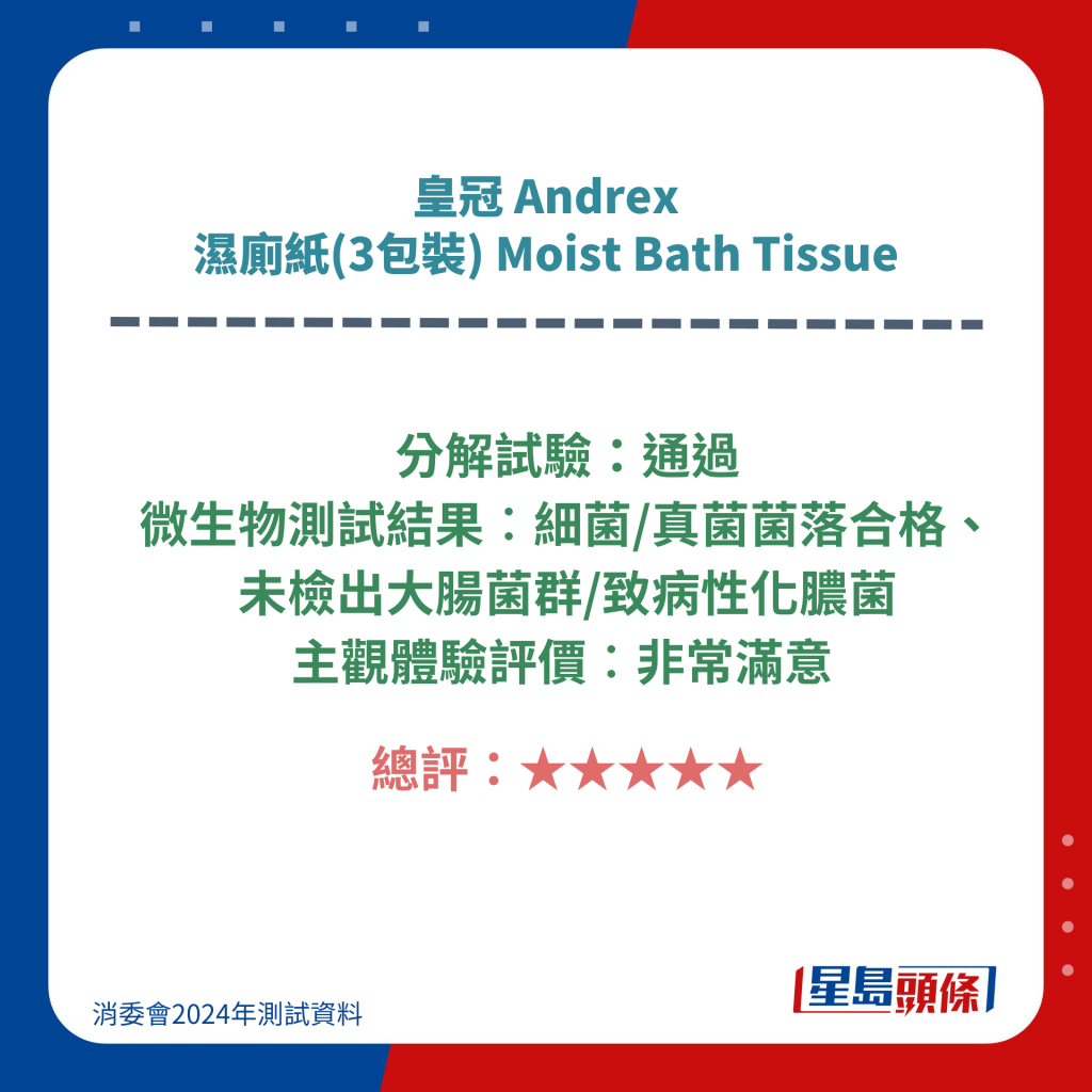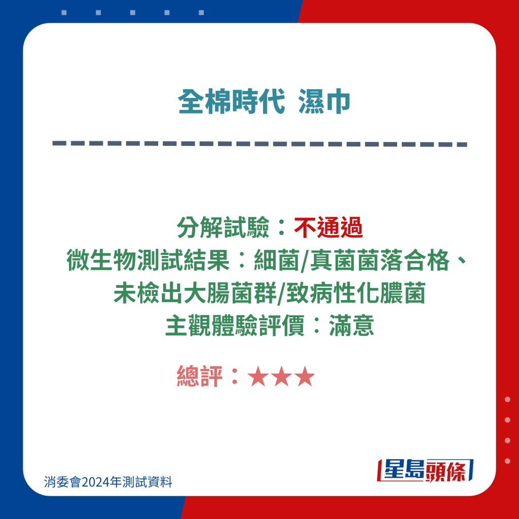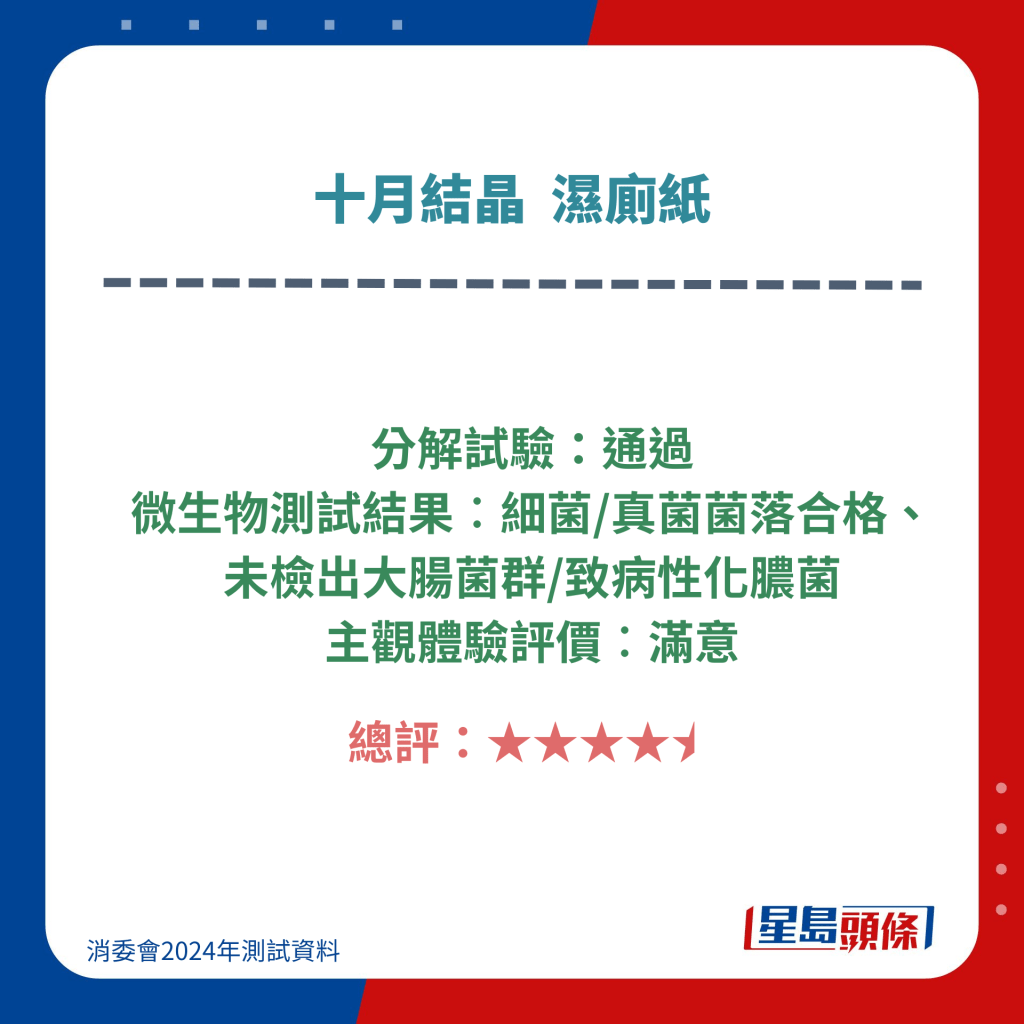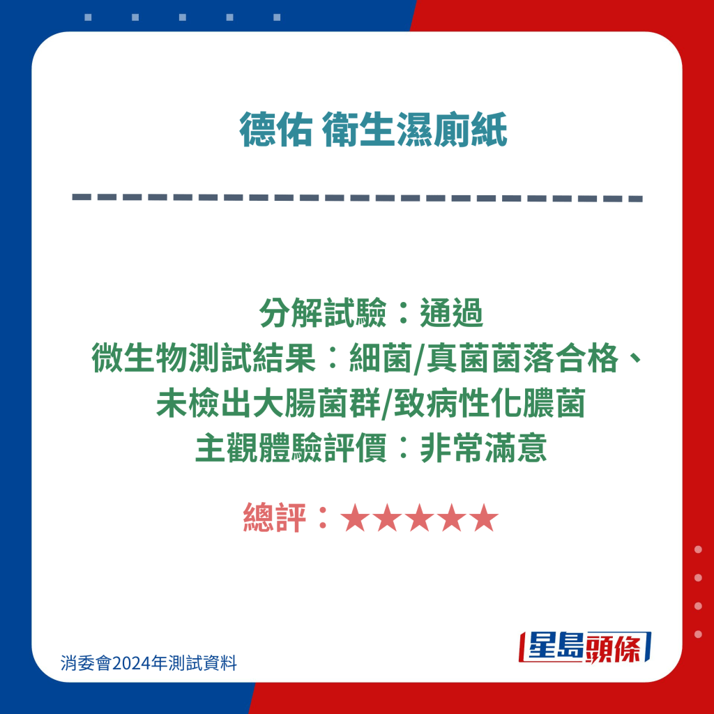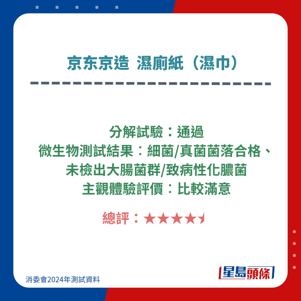 消委会在针对湿厕纸产品的评估中,测试人员针对产品的使用便利性、外观、尺寸、气味及对皮肤的即时刺激性进行了详细测试。参与评估的10位测试者年龄介于18至55岁,根据各项指标给予“满意”、“一般”和“不满意”的评价,最终综合得出总体评分。