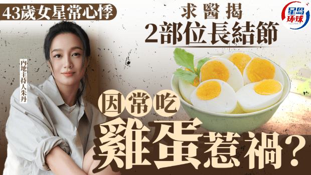常吃鸡蛋也影响健康?内地43岁知名主持人朱丹12月11日在直播中透露,心悸症状近年越来越严重,到医院检查后更发现她体内有2个部位长出结节,医生表示原来与她多年常吃鸡蛋的饮食习惯有关。