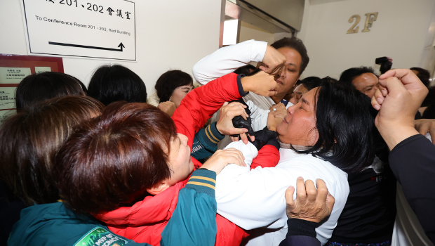 ▲“立法院内政委员会”16日排审选罢法修正草案,国民党“立委”预先守住前往会议室的通道,蓝绿双方僵持在通道上,数度爆发拉扯及口角。