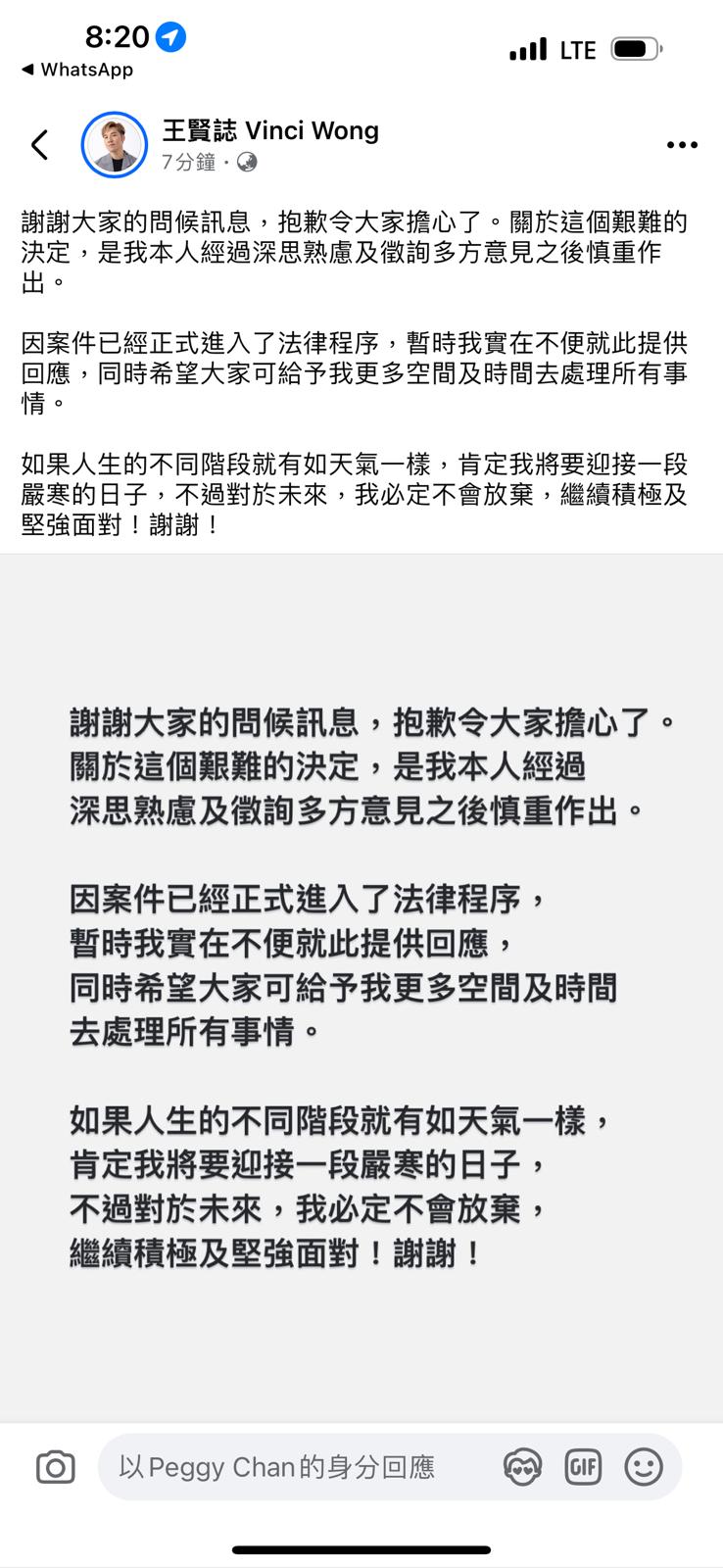 王贤志昨日晚上在社交平台留言说:“谢谢大家的问候讯息,抱歉令大家担心了。关于这个艰难的决定,是我本人经过深思熟虑及征询多方意见之后慎重作出。因案件已经正式进入了法律程序,暂时我实在不便就此提供回应,同时希望大家可给予我更多空间及时间去处理所有事情。如果人生的不同阶段就有如天气一样,肯定我将要迎接一段严寒的日子,不过对于未来,我必定不会放弃,继续积极及坚强面对!谢谢!”
