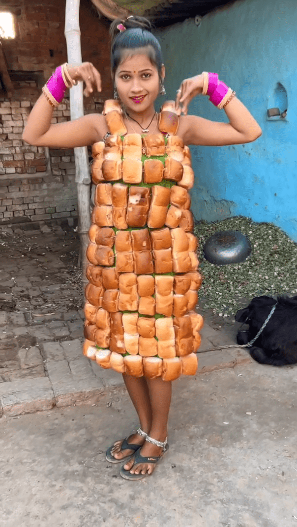 该影片显示,Sonpal Sharma先是拿出一大盘面包,并吃掉一个。镜头一转,她便穿上一条由面包拼接而成的裙子。
