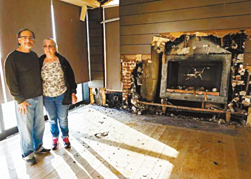 ▲马里布市议员西尔弗斯坦和妻子明迪(Mindy)站在自家遭山火烧坏的客厅里。洛杉矶时报