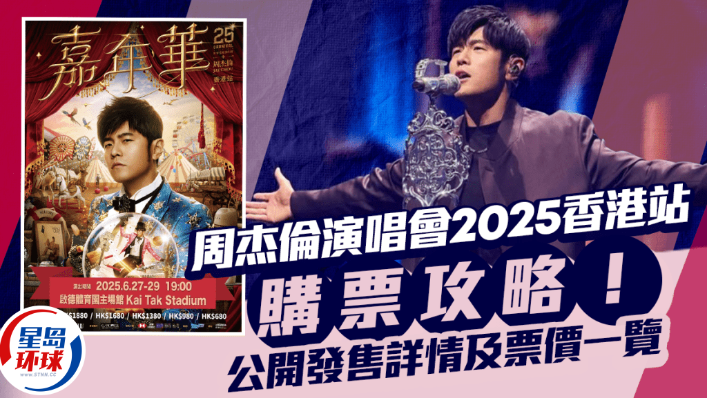 周杰伦演唱会香港站2025的公开发售日期将于2024年12月21日开始! 周杰伦演唱会将于2025年6月底,在启德体育园主场馆举行一连三场《嘉年华世界巡回演唱会》,票价由680元至1880元。 《星岛头条》为大家不断更新周杰伦演唱会香港站2025的购票方法、优惠及演唱会座位表等资讯。