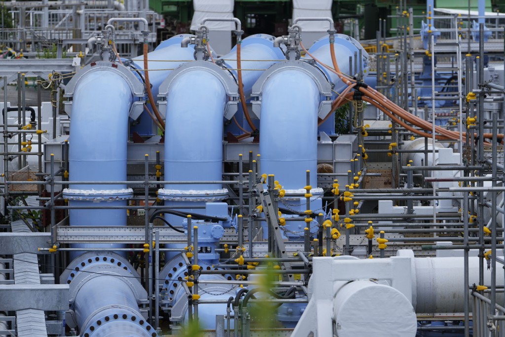▲福岛核电厂将核污水排放至大海的蓝色输送水管。美联社
