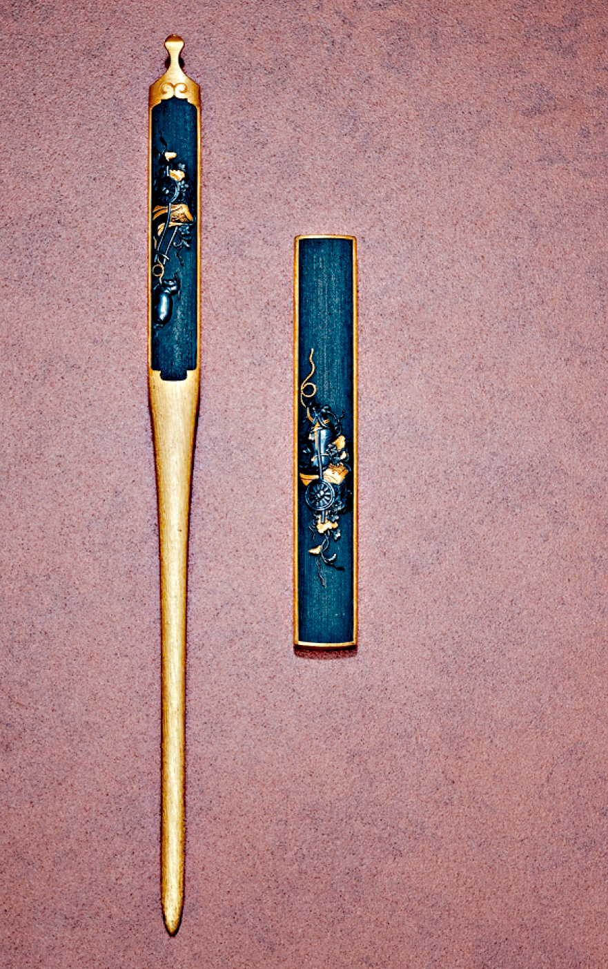 ▲鎏金赤铜牛车图案小刀手柄(小柄)及发饰,原本插于刀镡。日本1800年代晚期作品,属私人收藏。
