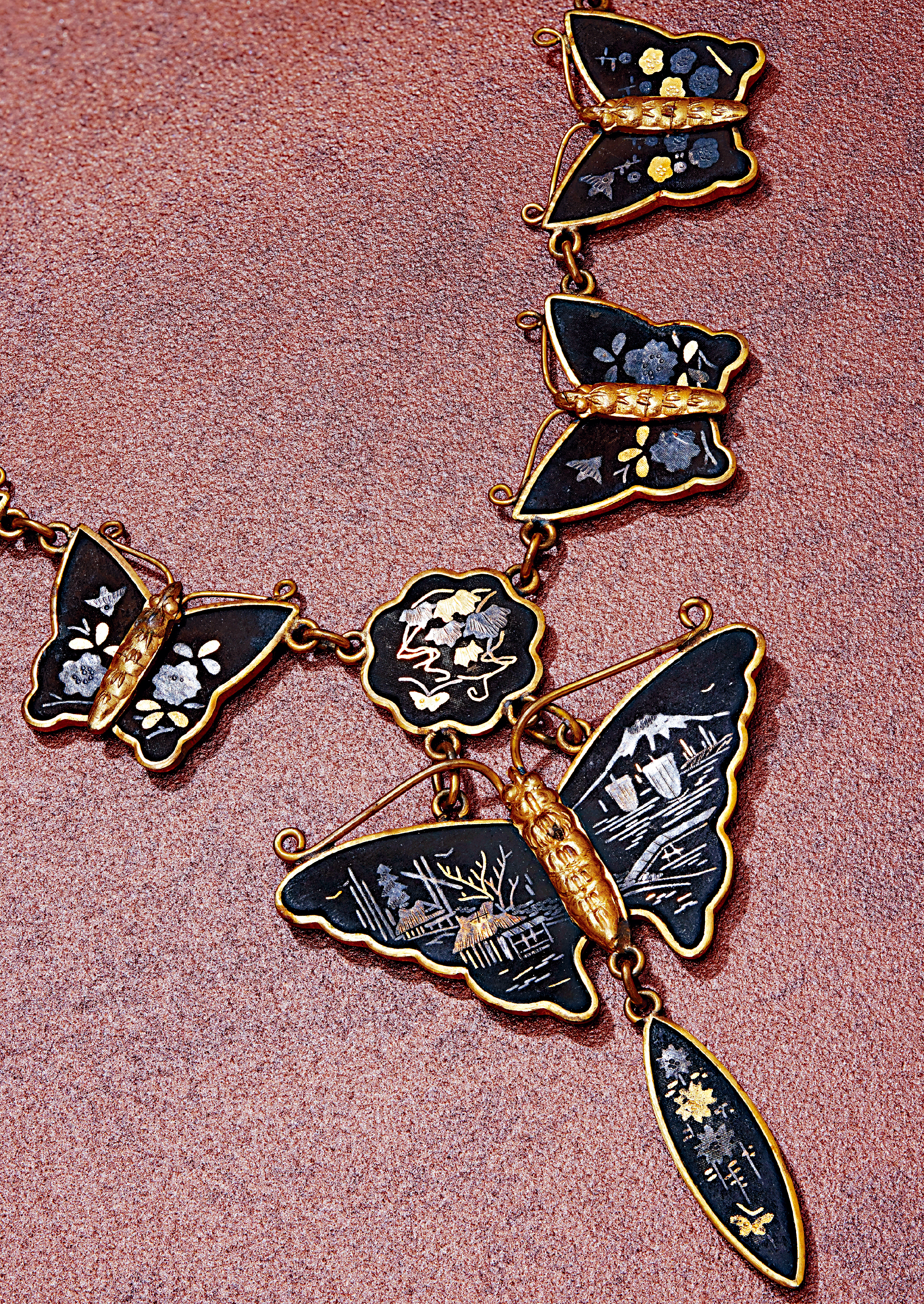 ▲鎏金银赤铜蝴蝶项链,日本1800年代晚期作品,属私人收藏。