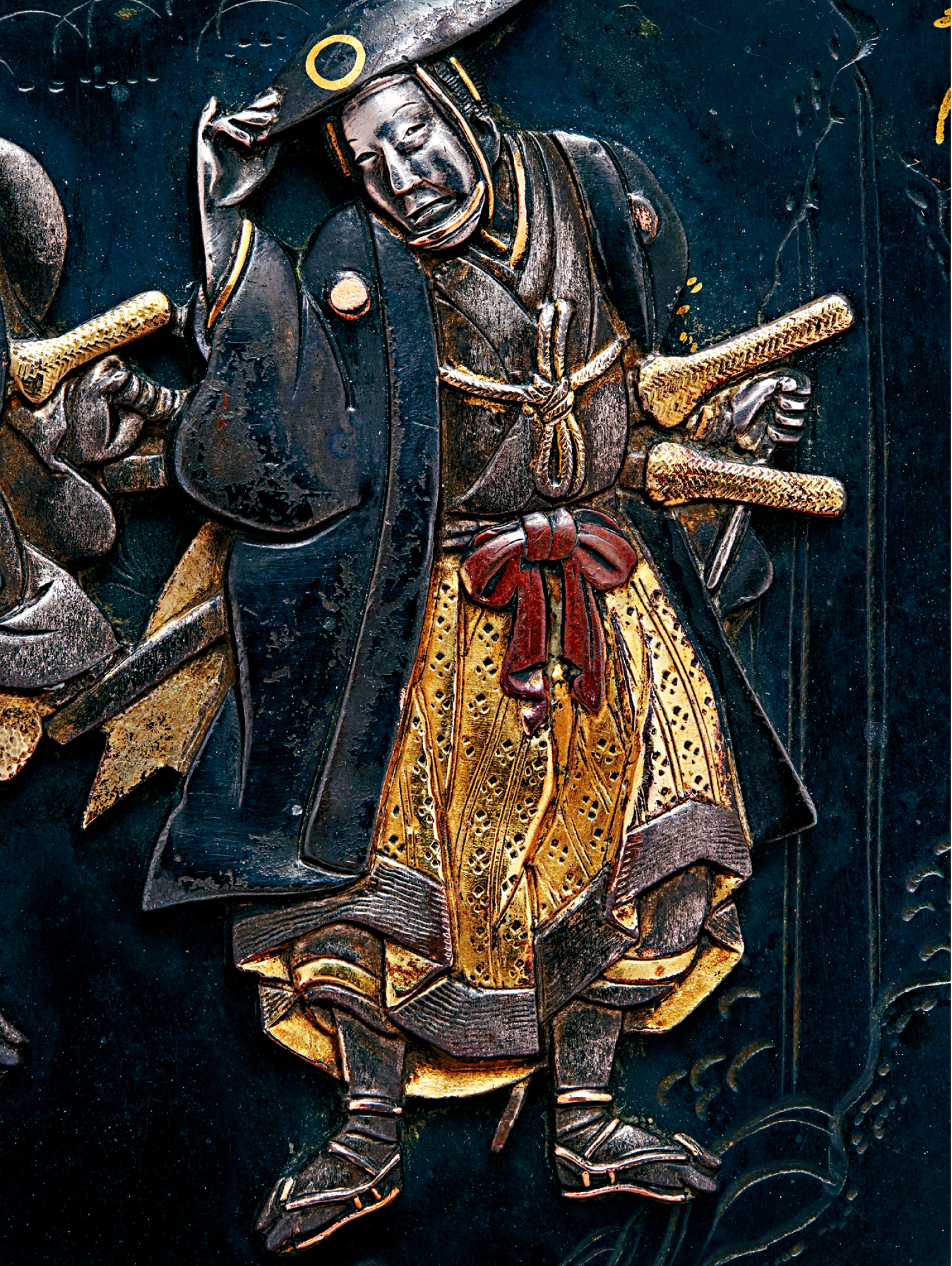 ▲鎏金银赤铜扣,形如刀镡,或以莳绘上色,图为扣上描画的其中一位持手 杖的年迈武士。日 本1800年代晚期作品,属私人收藏。