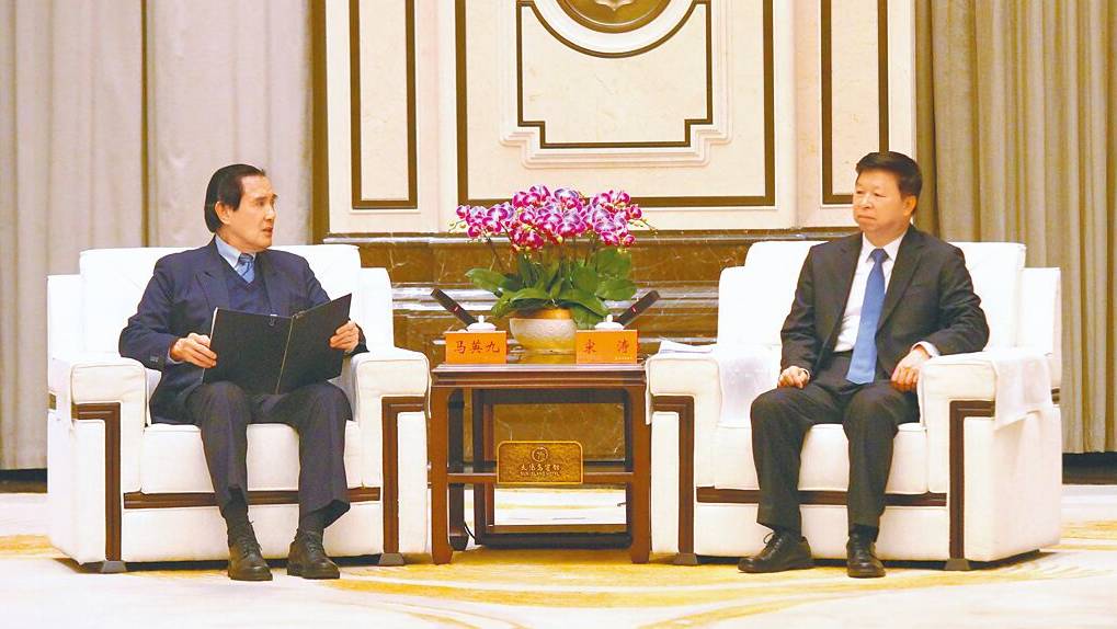 ▲马英九(左)18日率台青赴哈尔滨参加“海峡两岸青年冰雪节”,晚间与国台办主任宋涛(右)会面。 中时