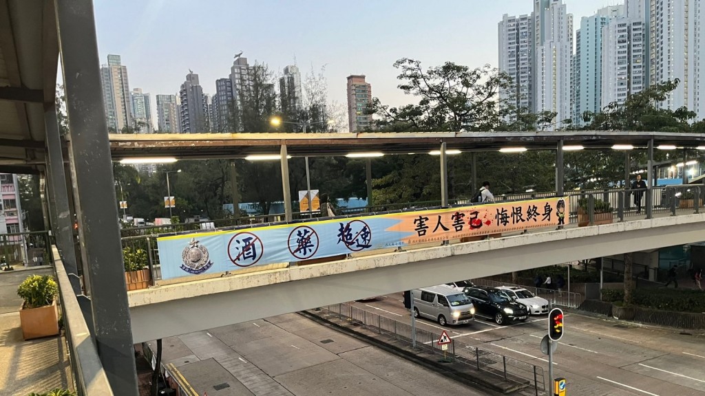 佳节临近,西九龙交通部于12月起在出入西九龙区的主要干道行人天桥上,悬挂大型道路安全横额,提醒司机切勿药后、酒后或超速驾驶,位置包括窝打老道、龙翔道、弥敦道、荔枝角道、东九龙走廊等。