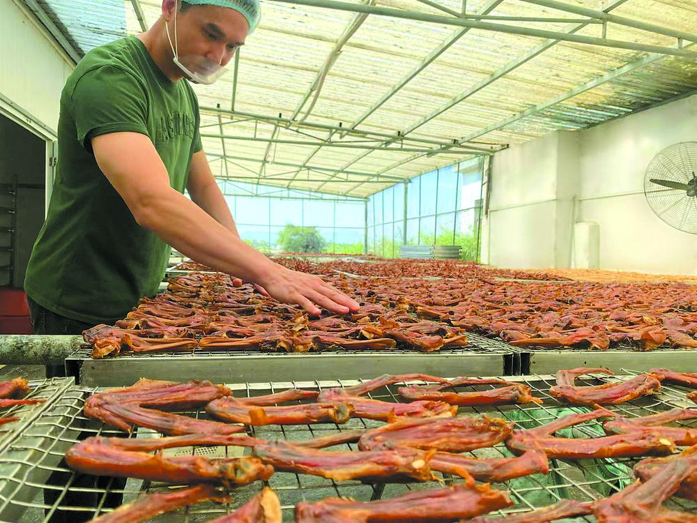 孟子云:“天时、地利、人和,三者不得,虽胜有殃。”鸭扎包独特风味的产生离不开“人和”的因素。从选鸭、配料、腌制到晾晒、包扎成品,鸭扎包的每一步制作工序都颇为考究。据了解,制作鸭扎包的鸭子必须选取莲洲镇本地饲养的麻鸭,饲养60天左右的成鸭为最佳原料。这个时候的鸭子刚好成熟,肉质鲜美且骨头也不会太硬,正好能够咬碎嚼烂。
