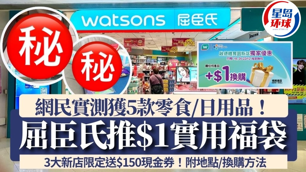 屈臣氏推$1福袋!屈臣氏推出超抵福袋优惠,只要符合一个条件即可于指定分店以$1换购精美礼品,有网民分享福袋礼品,当中包括4至5款零食及日用品,大赞实用! 另外3大屈臣氏新店亦限定送高达$150现金券,即看$1福袋详情、换购方法!