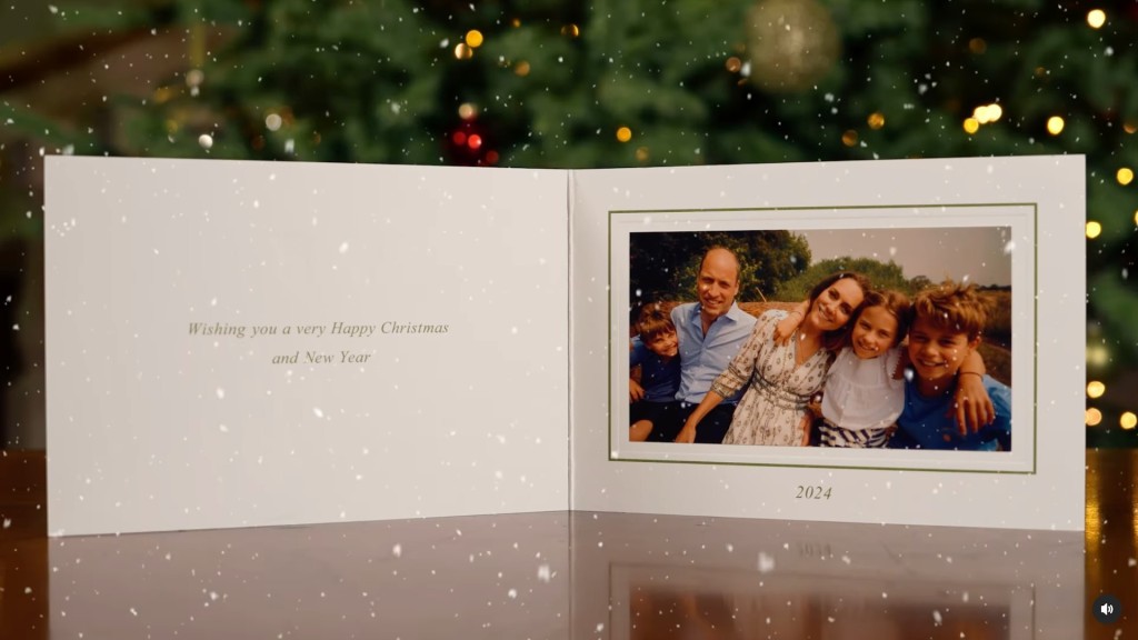 威廉和凯特去年12月10日就公布圣诞贺卡,今年时间晚了一些,但依旧诚意十足,夫妻俩还特地以影片方式呈现贺卡,背景有圣诞树的灯光闪烁,加上下雪特效,节庆气氛浓厚。