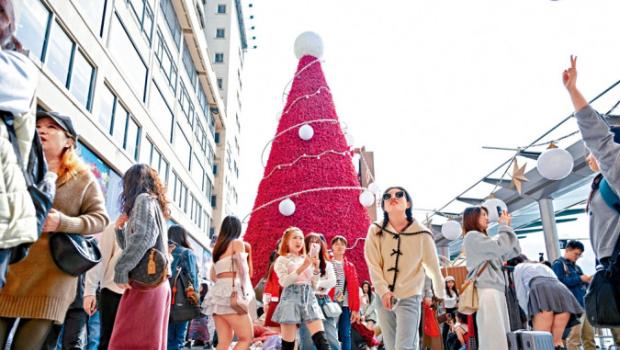 ▲尖沙咀海港城外摆放一棵红色圣诞树,游人争相“打卡”。